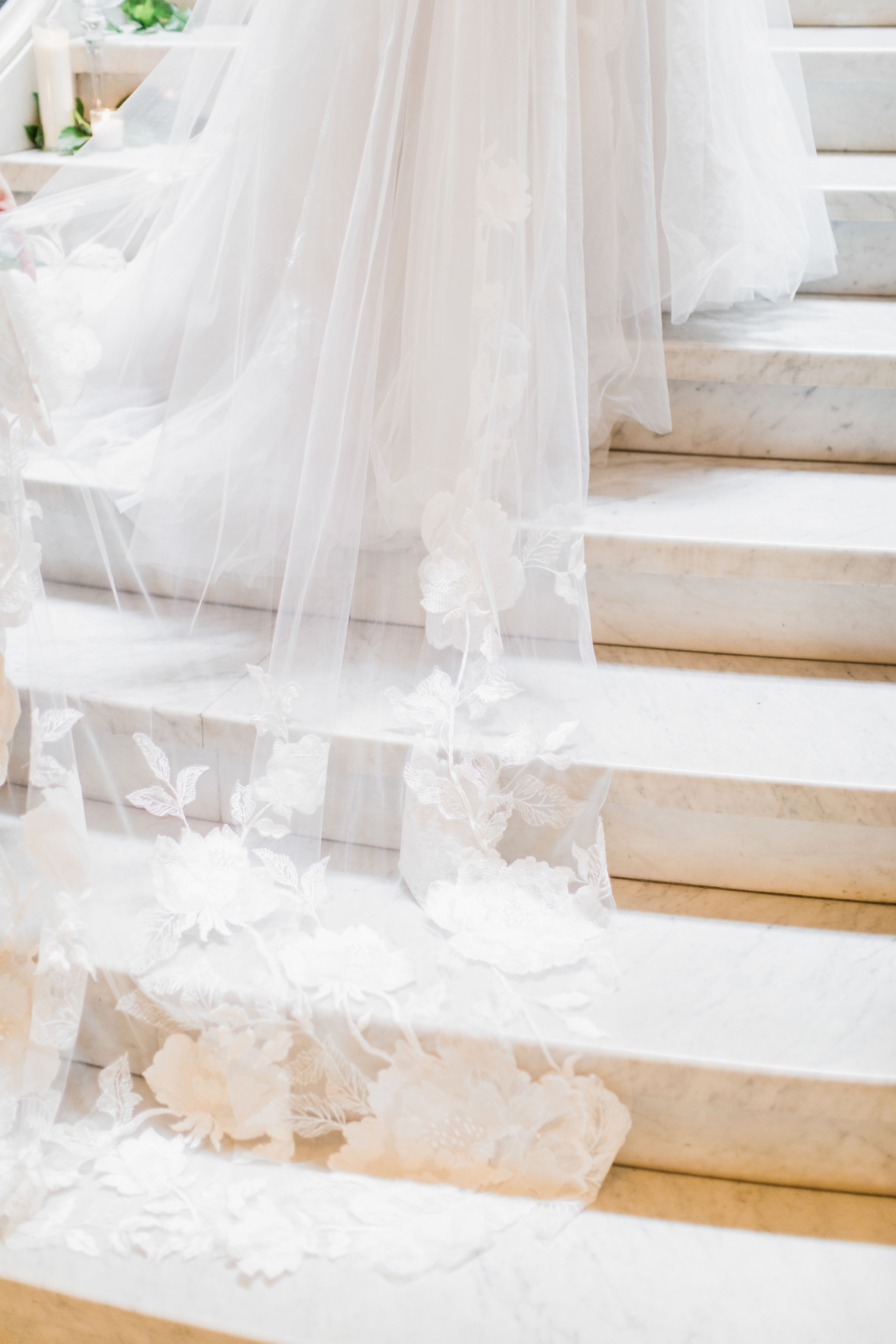 Michelle and I go way back to attending the same grade school where we also were cheerleaders from there and into highschool! Reconnecting with her on her gorgeous Watters bridal gown alterations and veil was lovely. Most of my work was spent on the gorgeous cathedral veil she had a vision for. Using lace supplied by the designer, we orchestrated the perfect veil to complete her ensemble.
